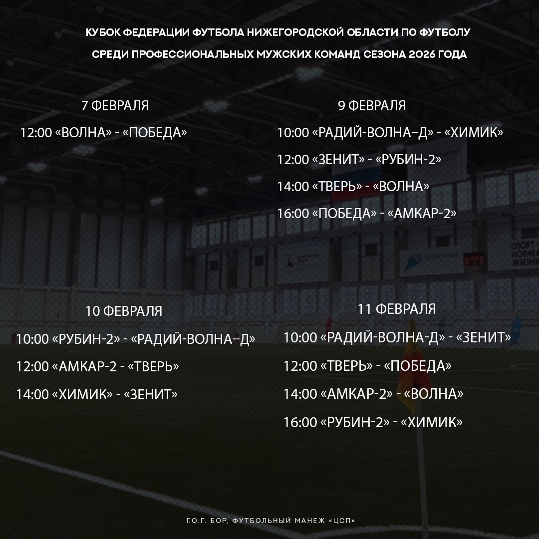 — Все игры турнира пройдут в Футбольном манеже «ЦСП» (г.о.г. Бор, Красногорка, 122). Посещение матчей Кубка – свободное. Однако на машине получится добраться лишь до бесплатной парковки возле КПП. Дальше – пешком через территорию базы «Академия 52».